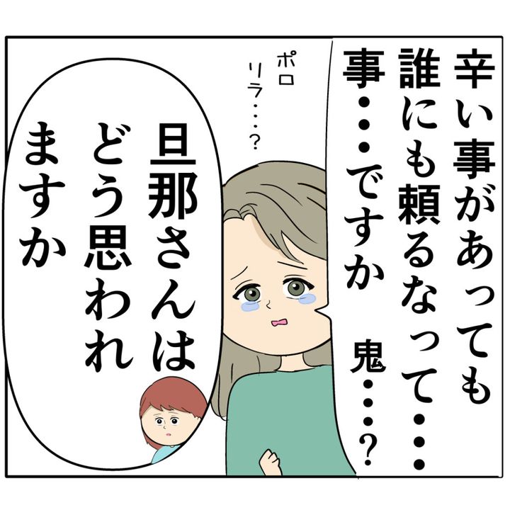すると、「辛い事があっても誰にも頼るなって・・事・・ですか・・鬼・・?」と涙を流して言うジュリ実さんの言葉はスルーして、「旦那さんはどう思われますか?」めいさんがたずねました。