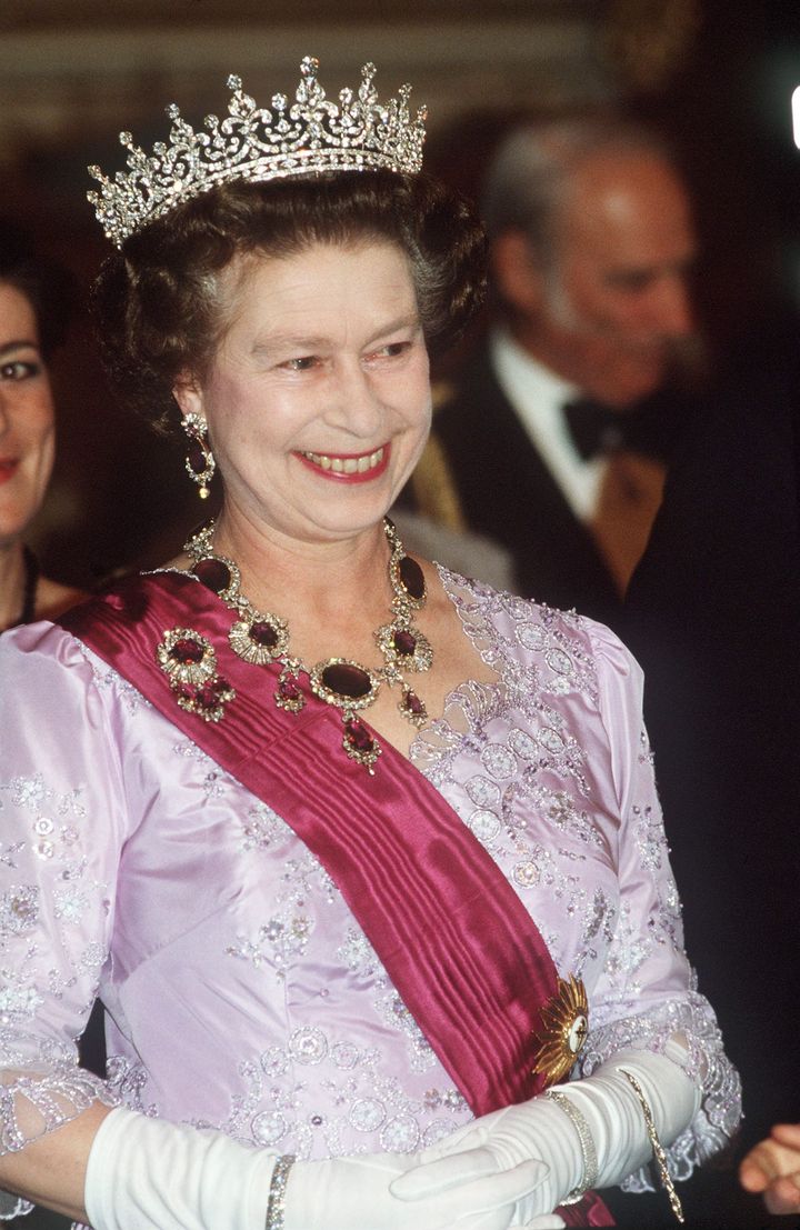 写真は、1985年3月にエリザベス女王がネックレスとイヤリング、ブローチを着用したときのもの。