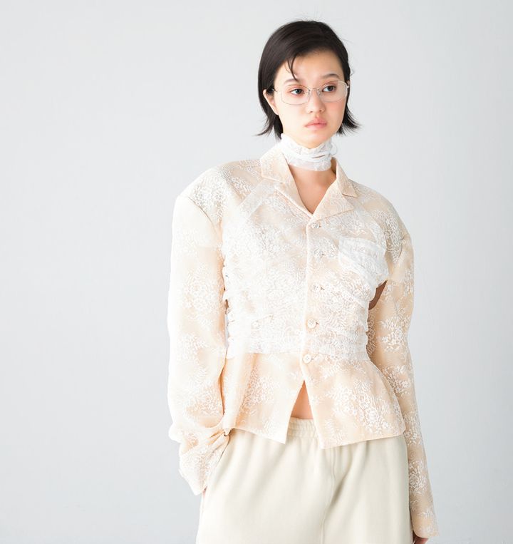 ジャケット¥165,000 レースネック¥14,300(共にアキコアオキ TEL:03・5829・6188) メガネ¥25,300(レイバン/ルックスオティカジャパン カスタマーサービス TEL:0120・990・307)