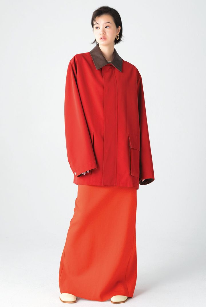 赤×レザーの襟の組み合わせが洗練された印象の一着。オーバーシルエットが今の気分にぴったり。