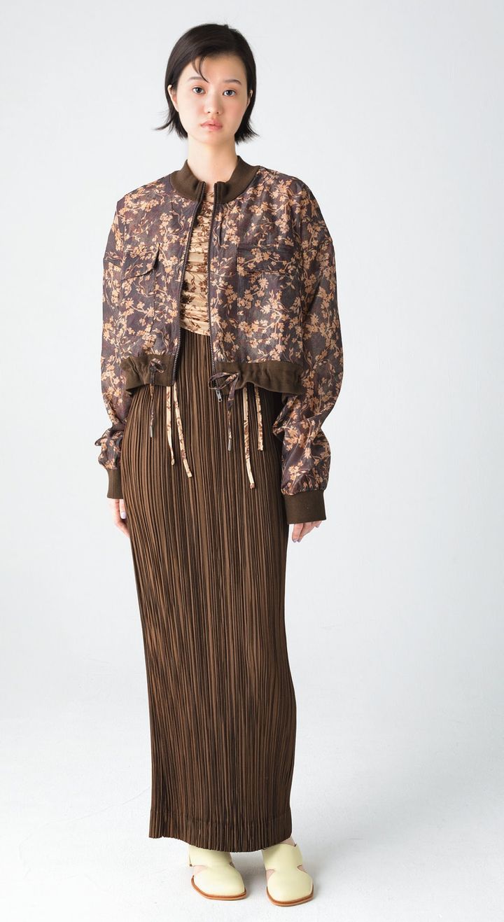 全面に小花柄をプリントしたジャケットは美しい透け感がポイント。首元や袖口、裾のリブ、リボンなどテイストの違うディテールが同居することで、唯一無二のムードに仕上がっている。ブラウントーンでまとめることで大人の表情に。