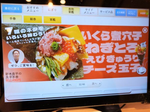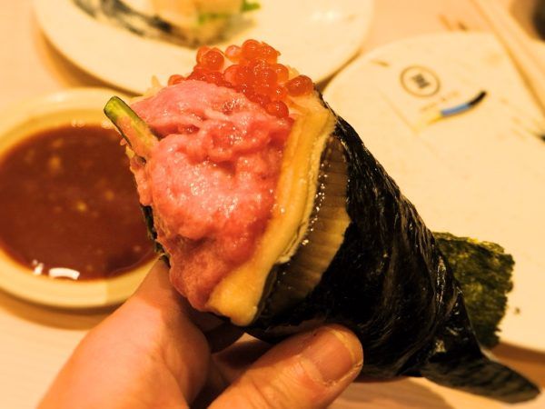 次に何を頼もうかな~とメニューを見ていると、いくら・煮穴子・ねぎとろ・えび・きゅうり・チーズ・玉子が入ったスペシャル手巻きを発見しました。おもしろ~い!