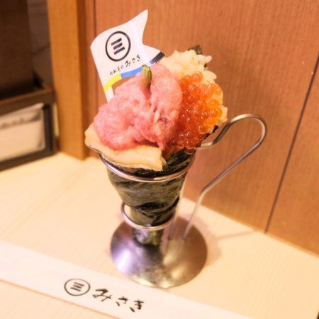 まるで手巻きパフェ、いや手巻きブーケですね! こぼれんばかりのイクラとねぎとろ。ピックもかわいいです。