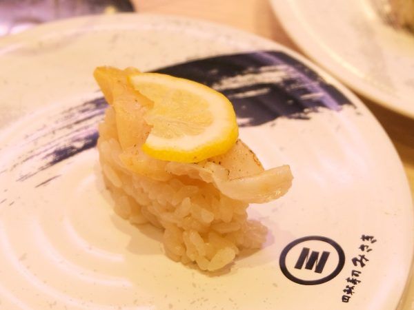 追加で、大好きな貝 つぶ貝炙り塩レモン一貫 を頼みました。コリコリ食感&レモンでさっぱり。