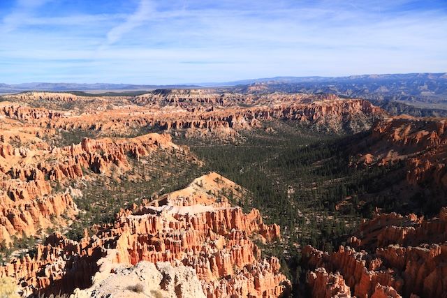 ブライスポイントとの違いは、よりフードゥー感が強い印象で、ギザギザしているユニークな地形を眺めることができ、地層の境目もはっきりわかります。谷底の緑が遠くになるので、色彩のコントラストを楽しみたい方は、インスピレーションポイントよりもブライスポイントがおすすめです。