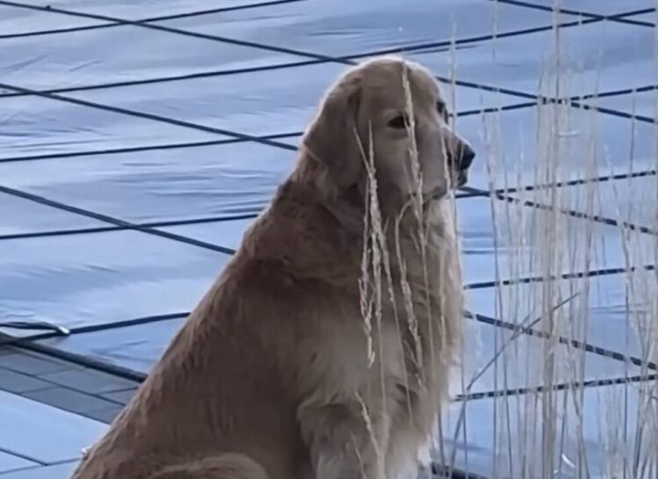 夏が恋しい! カバーのかかったプールをじっと見つめる犬さん