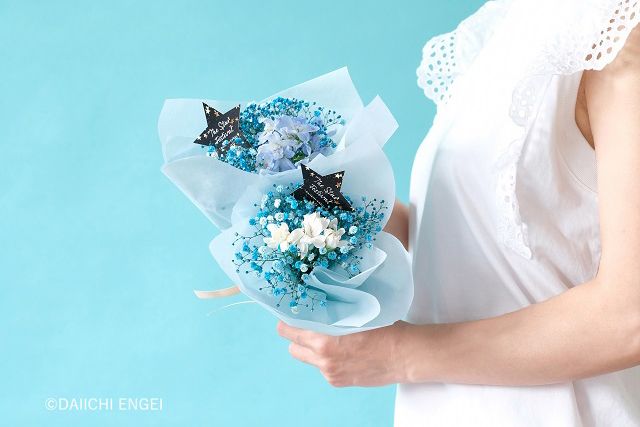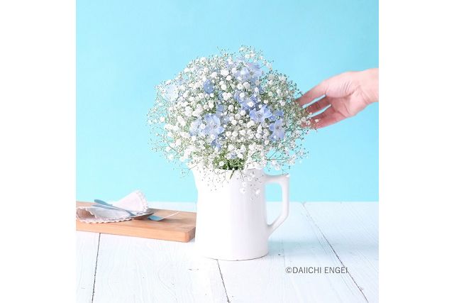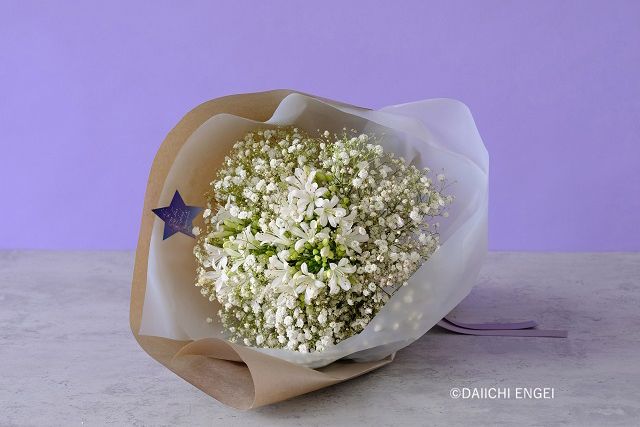 カスミソウは夏の暑さに比較的強い花なので、生花を贈るのが難しい7〜8月の贈り物としてもおすすめです。大きなブーケにするとカスミソウだけでもとても見栄えがします。