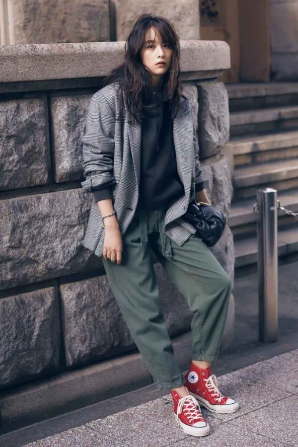 メンズライクなオーバーサイズのチェックジャケットに、黒のフーディを合わせたこなれ感たっぷりのスタイル。リラックス感のあるカーゴパンツを選ぶことで、程よいカジュアルさが加わり、抜け感のあるバランスに仕上がります。足元にはアクセントとして鮮やかな赤のスニーカーを投入し、遊び心のあるスタイリングに。