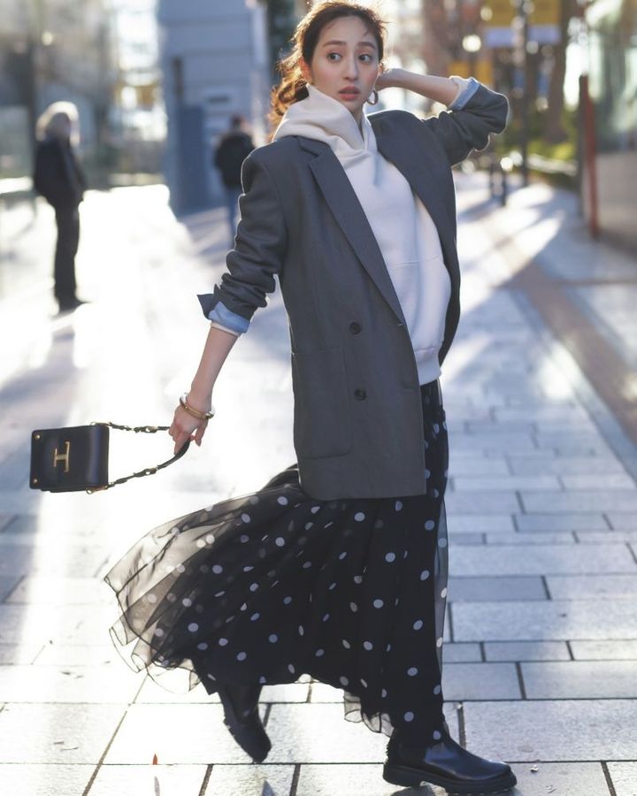 オーバーサイズのジャケットに白のフーディをレイヤードし、今っぽいカジュアルな抜け感を演出。肉厚なフーディで上半身にボリュームを持たせつつ、ボトムスにドット柄の透け感のあるロングスカートを合わせることで、女性らしい軽やかさが備わります。仕上げにクラシカルなミニバッグを合わせ、エレガントなムードを散りばめて。
