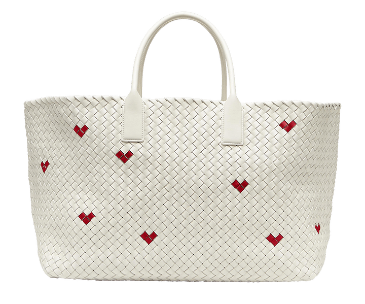 2025年もボッテガ・ヴェネタからバレンタインデーに向けて、可愛いハートをあしらったアイテムが揃うカプセルコレクションが登場。このデザインは、あらかじめ一部を彩色したフェットゥーチェ(革ひも)を巧みに織り込み、計算された場所に配することでハートシェイプを表現するという、なんとも高度な職人技なくして完成しないもの。2024年は1アイテムに1ハートだけだったのに、今回はなんと複数個あしらわれている品まであるではありませんか! さらに、今年はカラバリも増。ホワイトレザーに赤いハートをあしらったVer.に加え、チェーリーレッドに白いハートのVer.もお目見え。どれもスペシャル感たっぷりで、ギフトにするにも、自分用に手に入れるにも全力でオススメします。