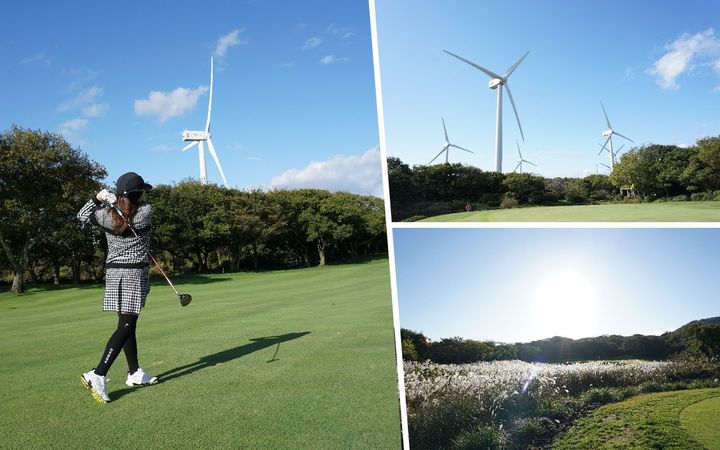 溶岩を活かしたレイアウトや、コースを彩るススキ、圧巻の風力発電機など、ホールごとに異なるユニークな景観で飽きさせない。