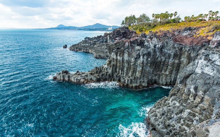 “柱状節理”とは、溶岩が海で冷却され、長い年月をかけて多角形の柱状に形成されたなんとも不思議な溶岩石群。「大浦柱状節理帯」は、約30~40mにも及ぶ岩柱が海岸沿い2kmに渡って連なる韓国最大規模の柱状節理帯で、天然記念物にも指定されています。崖に沿って遊歩道が整備されていて、スリルと迫力満点の散策を楽しむことができる人気の観光スポット。写真映えも抜群です。遠くには手を振ってくれる海女さんの姿も。