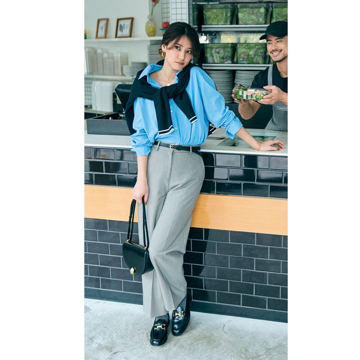 2.V開きカーデ¥18,700(Stola.)パンツ¥14,300(オリヒカ/オリヒカ池袋東口店)バッグ¥40,700(アーカイブエプク)ローファー¥29,700(カミナンド/グラビテート)ベルト¥8,800(ロー ソウル)ソックス¥1,760(靴下屋/タビオ)イヤリング¥6,600(アビステ)ネックレス¥15,180(ベン・アムン/ZUTTOHOLIC)ブレスレット¥12,100(サローネ サーティ/フォーティーン ショールーム)とろみシャツ着回し