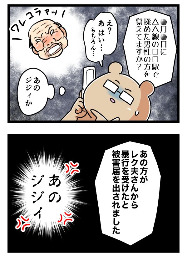 おじさんが何度も同じ迷惑行為を繰り返していたことに一番腹が立ちました。絡まれた人はもちろん、怪我をしてないのに救急車を呼んだり、警察のお世話になったり…どれだけ広範囲に迷惑かけてるのか分かってるの!?と許せない気持ちになりました。
