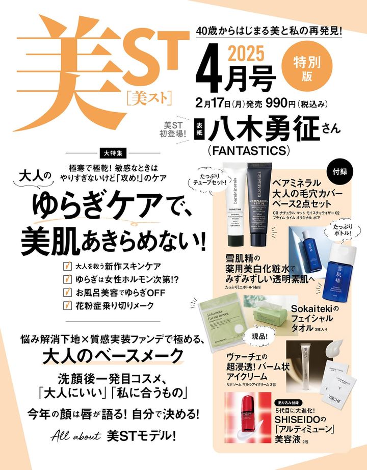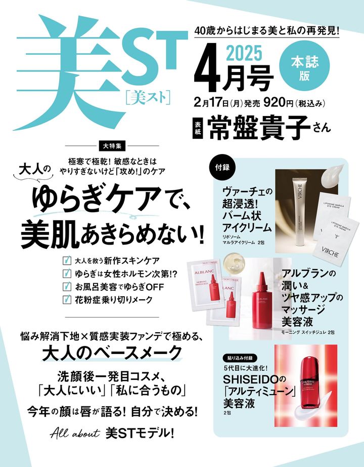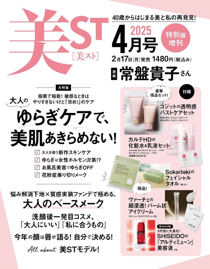 2月17日(月)発売・美ST4月号の月号のネット書店での予約受付がスタート!本誌・特別版増刊は常盤貴子さん、特別版は八木勇征さん(FANTASTICS)が初表紙を飾ります!付録は、共通でSHISEIDOの最新美容液とヴァーチェのバーム状アイクリームを。本誌付録はアルブランのマッサージ美容液のパウチ、特別版付録は雪肌精とベアミネラルがたっぷりボトルで。特別版増刊にはカルテHDの化粧水&乳液と、コジットのバストケアセットが現品付録で。特別版・特別版増刊にはさらにSokaitekiのフェイシャルタオル現品がつきます!豪華仕様につき完売必至です、お早めにご予約を!