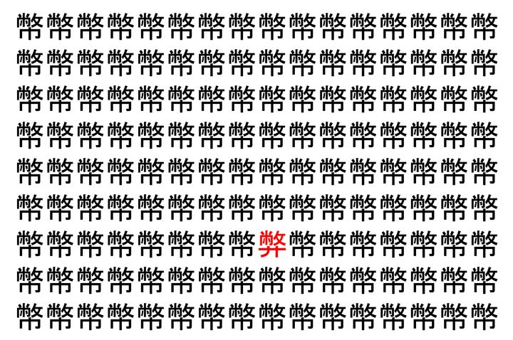 画像の中には、「幣」という漢字が縦に9行、横に16個並んでいます。 全部で144個となりますが・・・、そのうち1つは「異なる漢字」となってますよ!!