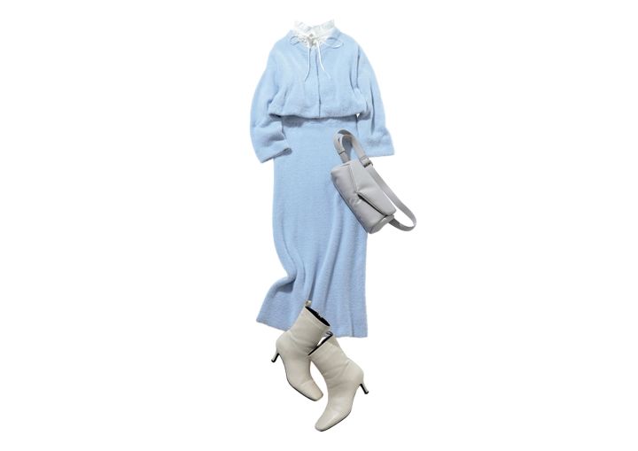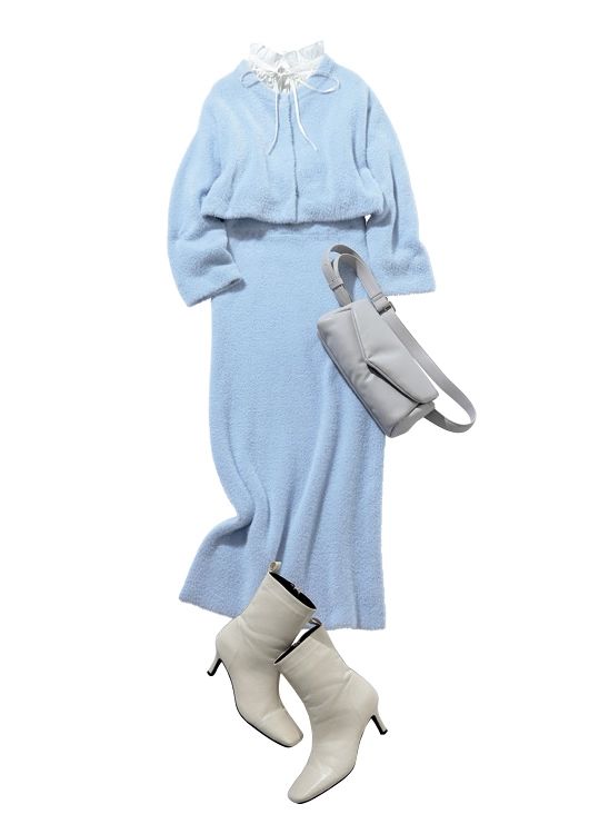 寒色ニットを主役にコーディネート。ニットセットアップにブラウスをインして、甘さの中に清潔感をプラス。「肌触りふわっふわ」「ニット上下で22,000円!?」と女子からの人気も上々。