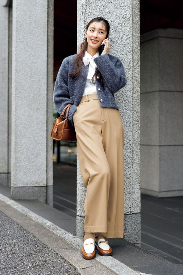 ニットジャケット¥25,300/ジャスグリッティー ブラウス¥9,790/WILLSELECTION(WILLSELECTION ルミネエスト 新宿店) パンツ¥9,990/アンフィーロ(オンワード樫山) イヤリング¥1,760/アネモネ(サンポークリエイト) ソックス[3足価格]¥1,188/チュチュアンナ バッグ¥198,000/J&M デヴィッドソン(J&M デヴィッドソン カスタマーセンター) ローファー¥14,300/ル タロン(ル タロン 有楽町マルイ店)