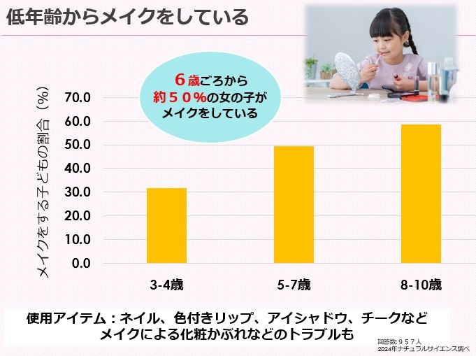 ナチュラルサイエンスが3歳から10歳の女児がいる愛用者に行った「お子さんはメイクをしていますか?」のアンケート調査によると、3~4歳の子どもでも30%がメイクをすることがある、5~7歳では50%、8~10歳では60%近くになり、小学生になる6歳頃になると約50%の子がメイクをしていることがわかったそうです。