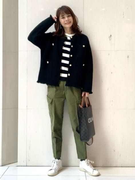 ニットカーデを主役にしたこちらのコーデ。ラメ糸を混紡したバスケット編みをベースに裾や袖口のフリジを施したツイードジャケットのようなつくりに。ボーダーとカーゴパンツを合わせたカジュアルすぎないミックススタイルです。