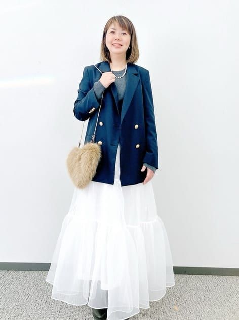 2.「かっちり系ジャケット×ふんわりスカート」で甘ニッシュに