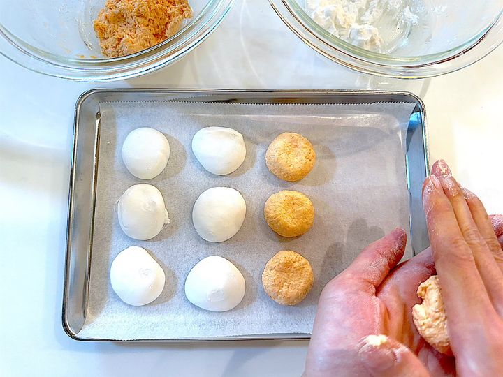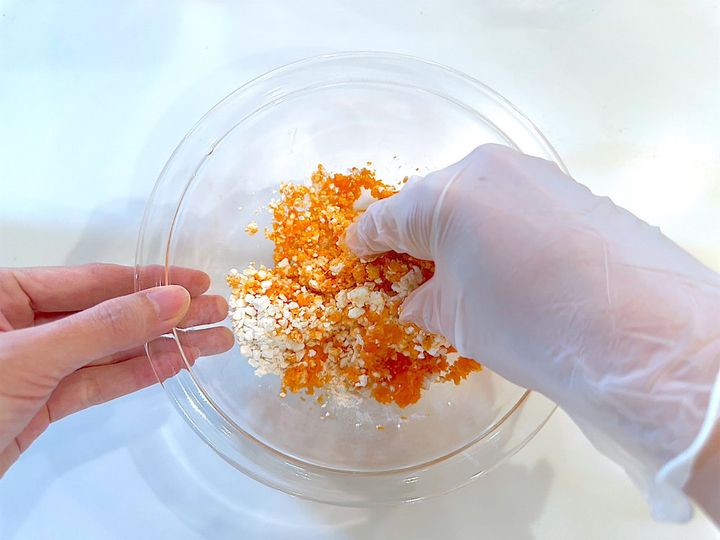 2. にんじん白玉用の白玉粉の中に、すり下ろしたにんじんを入れ、耳たぶくらいの柔らかさになるよう水の量を調整しながら加えてこねる。