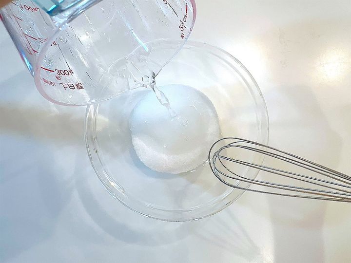 1. 砂糖と水を器に入れ、レンジ(500W)で2分加熱してシロップを作る。