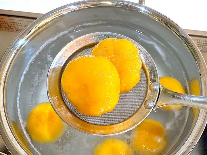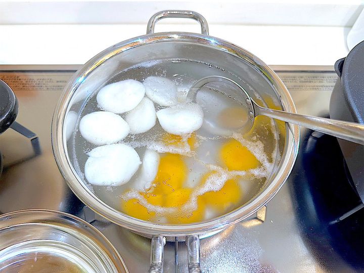 4. 白玉が浮き上がって1〜2分したら、すくい上げて冷水に取る。
