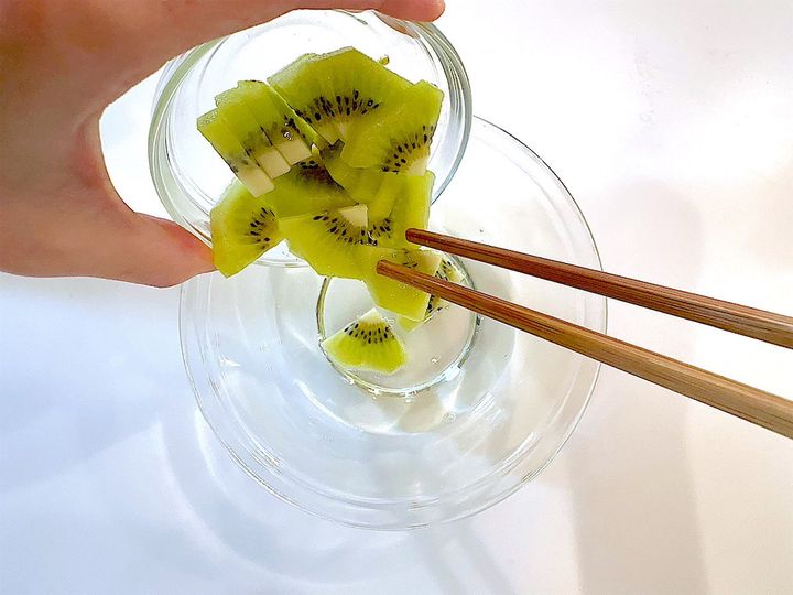 加熱したら熱いうちによく混ぜ、いちょう切りにしたキウイを加えて軽く混ぜたら、冷蔵庫で冷やしておく。