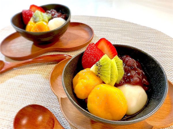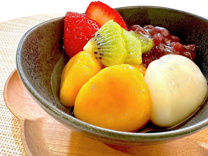 5. 器によく水気を切った白玉を盛り付け、1のシロップをかけて、ゆであずきを添える。