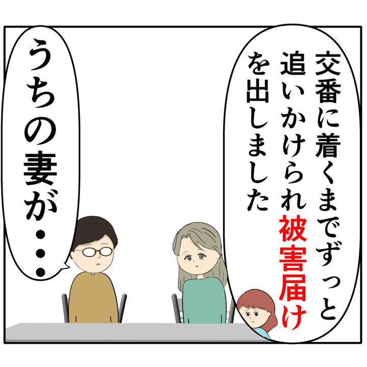ジュリ実さんに付き纏いをされたと旦那さんに訴えるめいさん。「交番に着くまでずっと追いかけられ、被害届を出しました」と言うと、「うちの妻が・・」と呟く旦那さん。