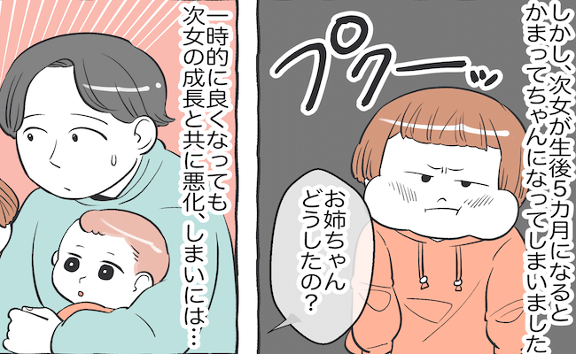 妹が生後5カ月になって寝返りができるようになると、長女はちょっとしたことでよく泣くようになり、かまってちゃんになりました。やがて数週間すると妹の成長を受け入れられるようになり、気持ちも落ち着いたようでした。