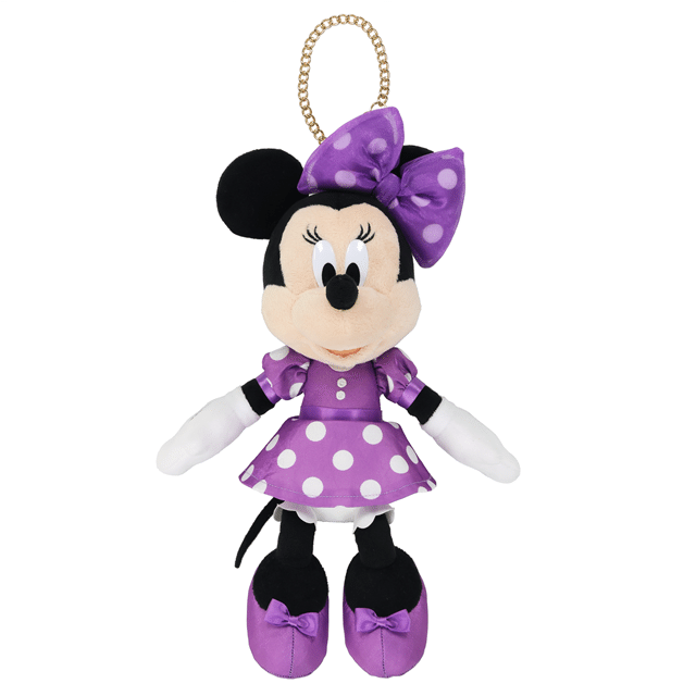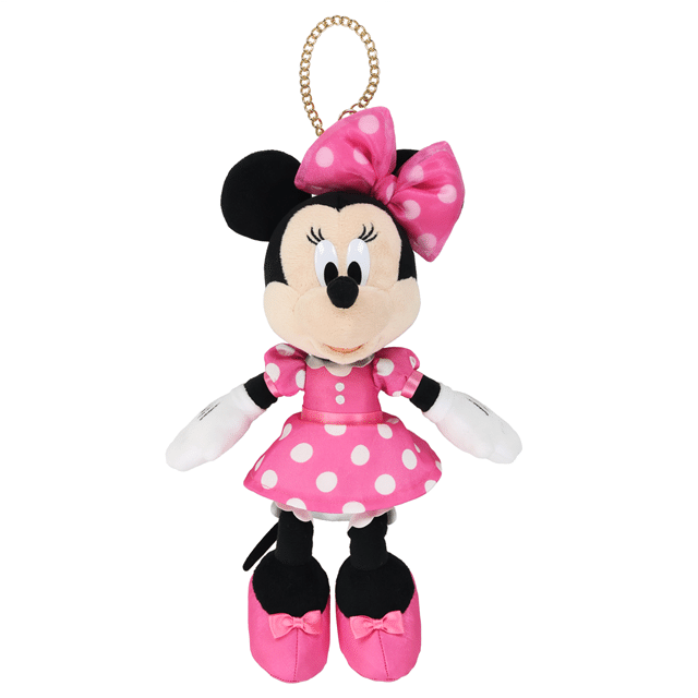 ドット柄のリボンとコスチュームを身に着けたミニーマウスのぬいぐるみチャームです。