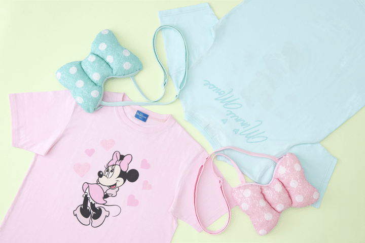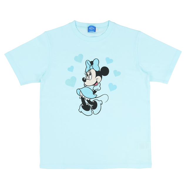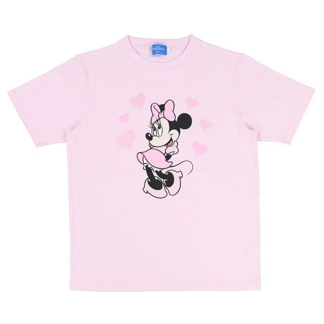 ミニーとハートがデザインされたTシャツ。コーディネートしやすいパステルカラーで、ピンクとブルーの2色がラインナップされています。