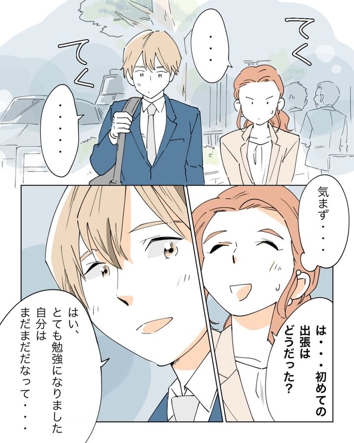 クライアントとの打ち合わせや食事会も終わり、ホテルに帰ることになったものの、反対方向のホテルに泊まる加賀谷くんに「心配だから送らせてください」と真剣な表情で言われ、断り切れず送ってもらうことに。二人並んで無言で歩くなか「気まず・・」と思いながらも「は・・初めての出張どうだった?」と聞くと、「はい、とても勉強になりました。自分はまだまだだなって・・」と謙虚に答える加賀谷くん。