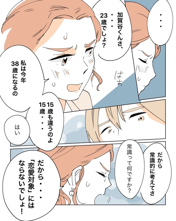 「・・・」少し考えた後、「加賀谷くんさ、・・23歳でしょ?私は今年38歳になるの。15歳も違うのよ。15歳・・」と一気に話すと、「はい」と静かに答える加賀谷くん。「だから、常識的に考えてさ」「常識って何ですか?」静かに、でも聞きたいことはちゃんと聞き返す加賀谷くんに、「だから・・『恋愛対象』にはならないでしょ!」とうとうハッキリ伝えたのでした。