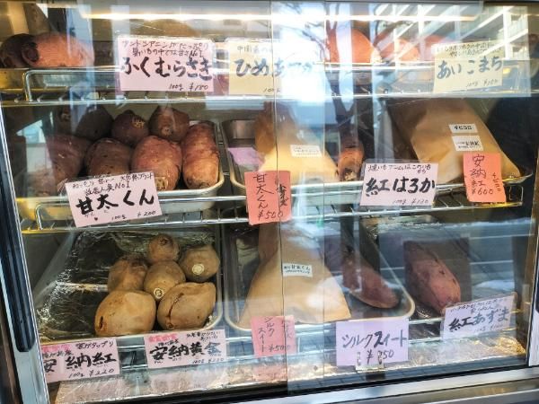 とーっても気になる焼き芋のショーケース! あまり見かけない名前もあって、ワクワク♪ 何種類ものお芋を目の前に、テンションが上がります(笑)