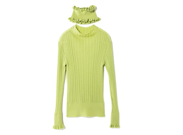 細番手のメリノウールを編み上げたニットトップスは、優しい肌当たり。細かなリブや袖口のフリル、両サイドのスリットなど、ディテールまでこだわりが溢れている。