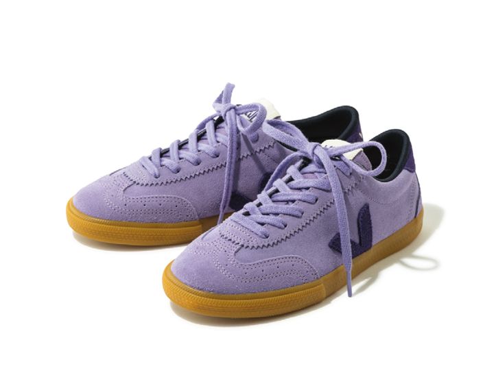 ラベンダーカラーが目を惹くスニーカー。アッパーはスエード素材ながら、撥水オイルを施しているので、小雨くらいなら気にせずに履くことができる。