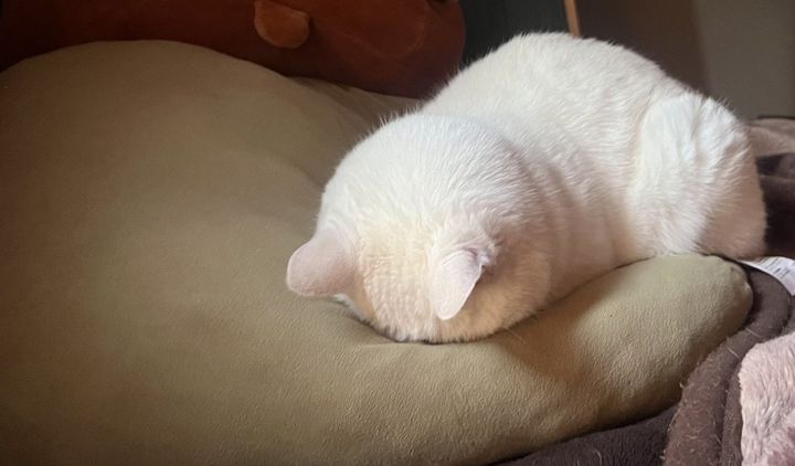 見事に柔らかいクッションにめり込んでいる愛猫。ここの柔らかさをチェックしているのか、気持ちが良くてたまらずこの姿勢になってしまったのか、なんともかわいらしいですよね。ぽすっ!という効果音がハマりそうです。