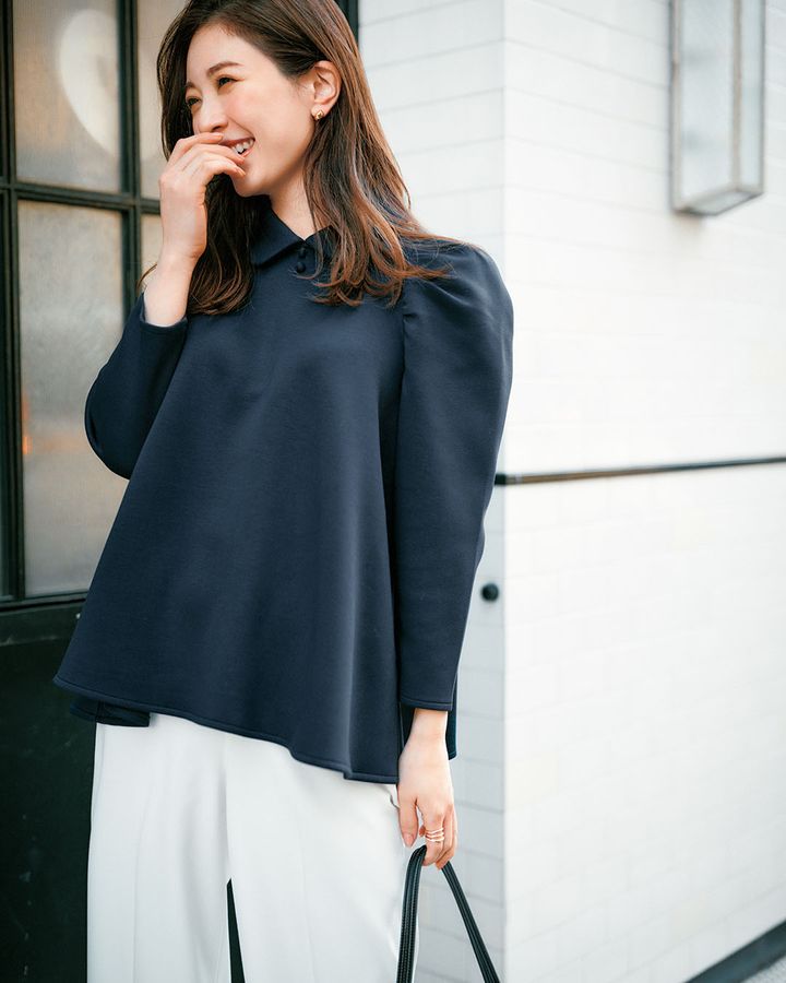 ブラウス¥9,900(ユイットブーケ)パンツ¥20,900(アンタイトル)バッグ¥19,800(アドカラム/アンソロジー)ピアス¥39,600(モニス/フォーティーン ショールーム)リング¥149,600(ココシュニック)