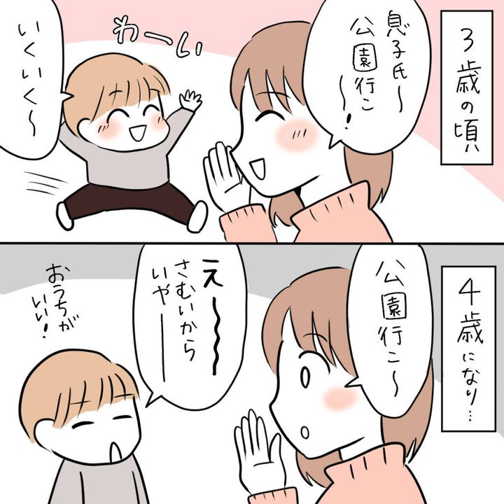 3歳の頃は「公園行こー!」と声をかけると「行く行くー!」と喜んでいた息子。しかし、4歳になった今は「公園行こー」と声をかけても「えー。さむいからいやー。おうちがいい!」と言うようになりました。