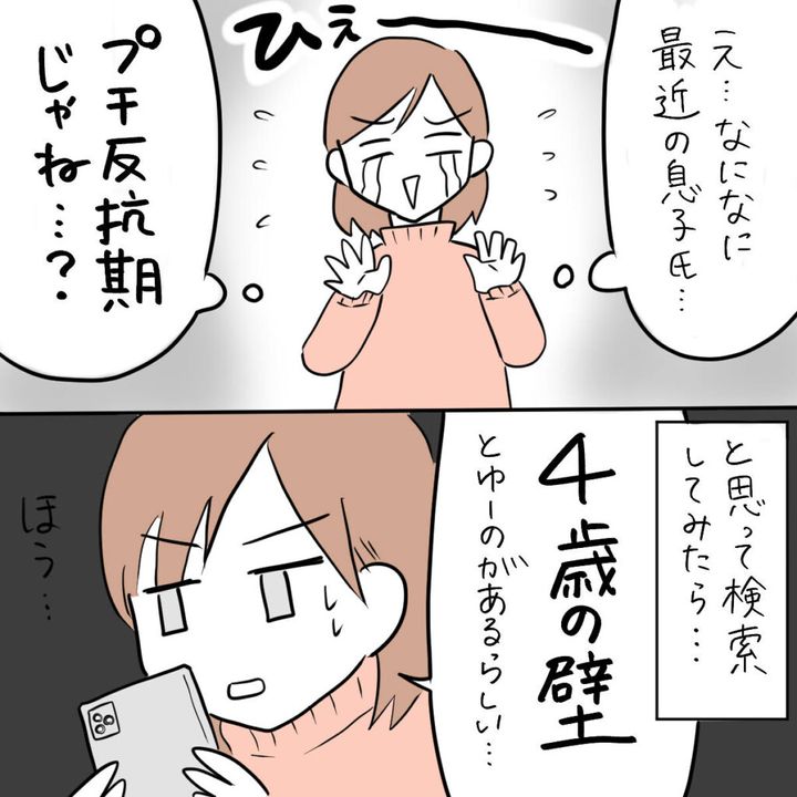 荒れる息子に私はタジタジ。「え・・・なになに。最近の息子氏、プチ反抗期じゃね・・・?」と思って検索してみたら・・・『4歳の壁』とゆーのがあるらしい。ほう・・・。
