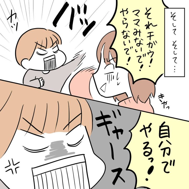 そしてそして・・・。「それチガウ!ママみないで!やらないで!」と勢いよく私の手を振り払い「自分でやるっ!」と怒りを全開にするようになった息子。