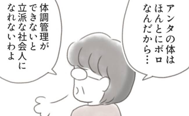 子どものころから「体調管理しないから病気になった」と母親に言われ続けた主人公。つらい過多月経も自分に悪いところがあるから治らないと考えてしまいます。