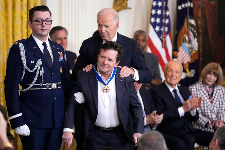 President Joe Biden, right, presents the Presidential Medal of Freedom, the Nation's highest civilian honor, to Michael J. Fox, center, in the East Room of the White House, Saturday, Jan. 4, 2025, in Washington.