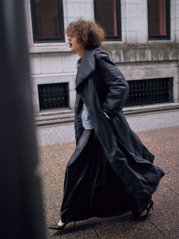【POINT】一見ダウンとは反対に位置する、ドレッシーなレザースカートとも波長が合う、長くふくらむ黒のインパクト。中はほぼ隠れるから、合わせる服に悩んだときも羽織るだけでエレガントなルックスが成立。