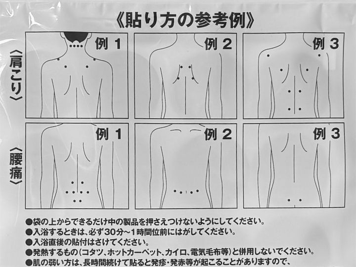 パッケージには肩こりと腰痛に効果的な貼り方の例が図で示されていました。