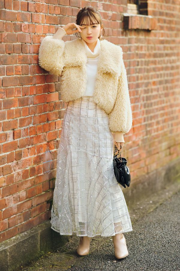 プードルのようにくるんとカールした表面感で、愛らしさも暖かさも満点なボアコートは上半身の薄さをカバーできるお得意アウター。ブルゾン風の丈がカジュアルなので、甘服が似合うウェーブさんはホワイト系のワントーンでフェミニンに振って。