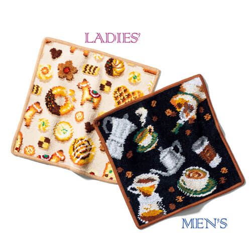 コーヒー好きな彼に贈るなら黒×茶のシックな配色の「コーヒーブレイク」のハンカチがおすすめ。自分用はあえて同じ柄にせず、カフェタイムを連想させるスイーツプリントでリンク感を出すのも小粋。